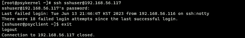 - 처음엔 PermitRootLogin 값을 no 라고 설정하고 root 사용자와 sshuser 사용자로 각각 접속해보세요.
