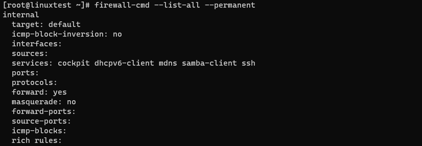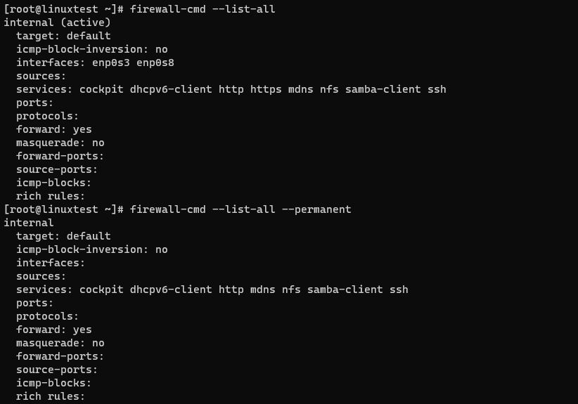 5. --permanent 옵션을 사용해서 internal 영역의 규칙을 확인해보세요. (영구규칙)