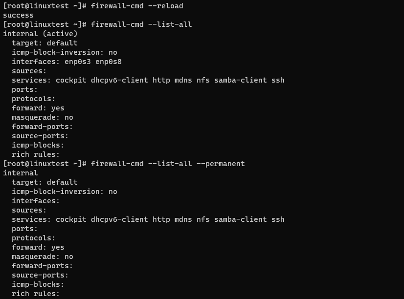 6. --reload 옵션을 사용해서 internal 영역의 규칙을 복구하고 확인해보세요.
