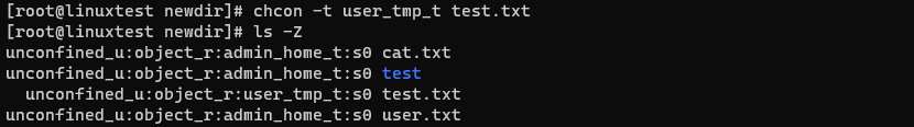 9. 새로 생성했던 파일을 chcon 명령어로 컨텍스트를 변경합니다. → user_tmp_t
